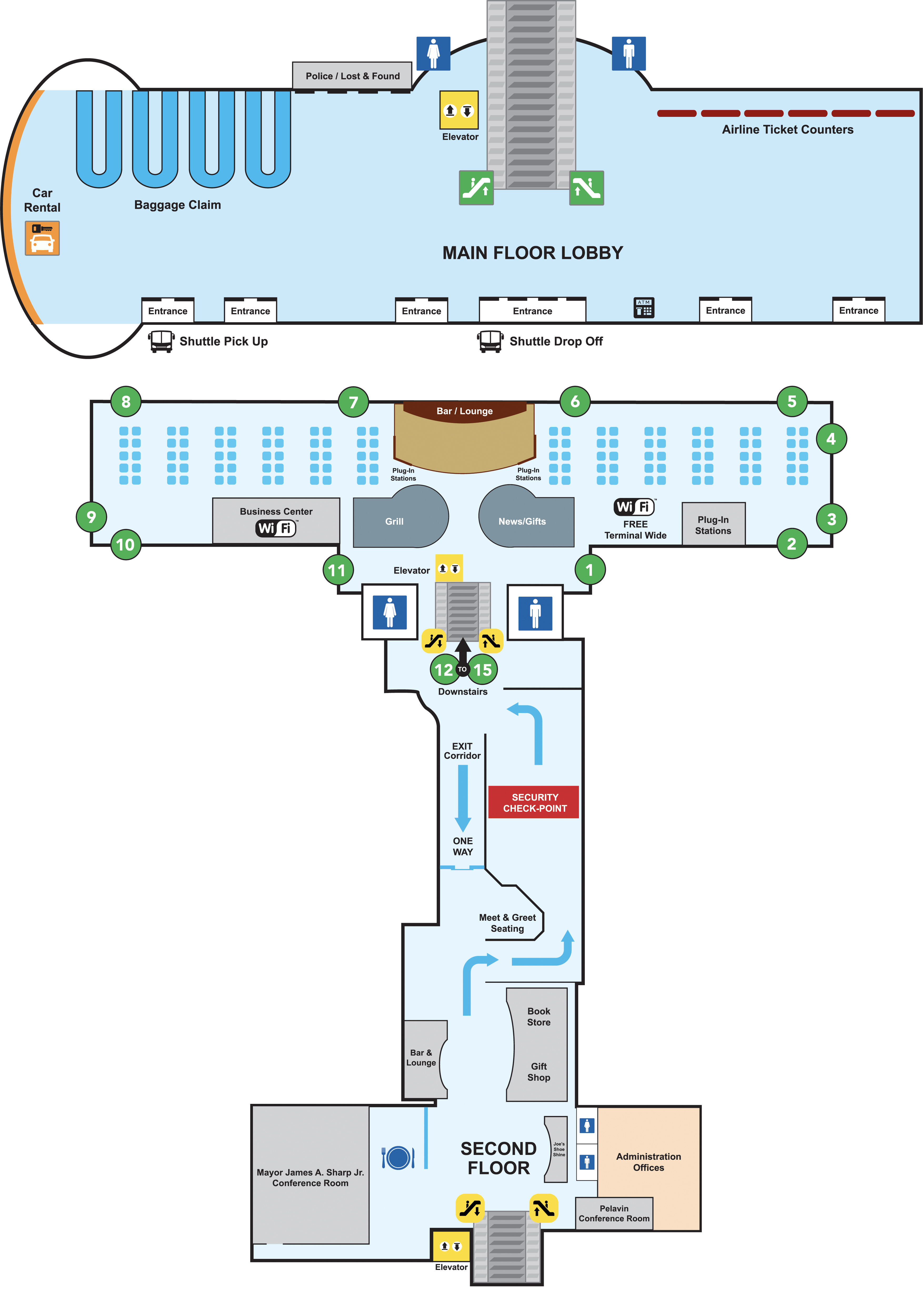Top image: Main floor lobby. From left to right. On the left, Car rental booths. The back left wall, the  Baggage claim area with 4 areas. Back wall left of the escalator is the Police, Lost and found office. Next to the is the woman's restroom and elevator. On the other side of the escalator is the men's restroom. On the back right wall is the Airline ticket counters. There are 6 entrances in the front with the shuttle pick up on the left and the shuttle drop off in the middle of the airport.          Bottom image: This is the second floor. At the top of the image are 12 terminal doors with a bar and lounge in the middle. There is a business center with free wi-fi, a grill, news and gift shop, free terminal wide, and plugin stations. In the middle are the escalators with the woman's restroom to the left and men's room to the right. Security checkpoint is in the middle along with meet and greet seating. There is a bar and lounge, book store, and giftshop there as well. At the bottom of the image is the conference room, another restaurant, admin offices and a second set of stairs and elevator.